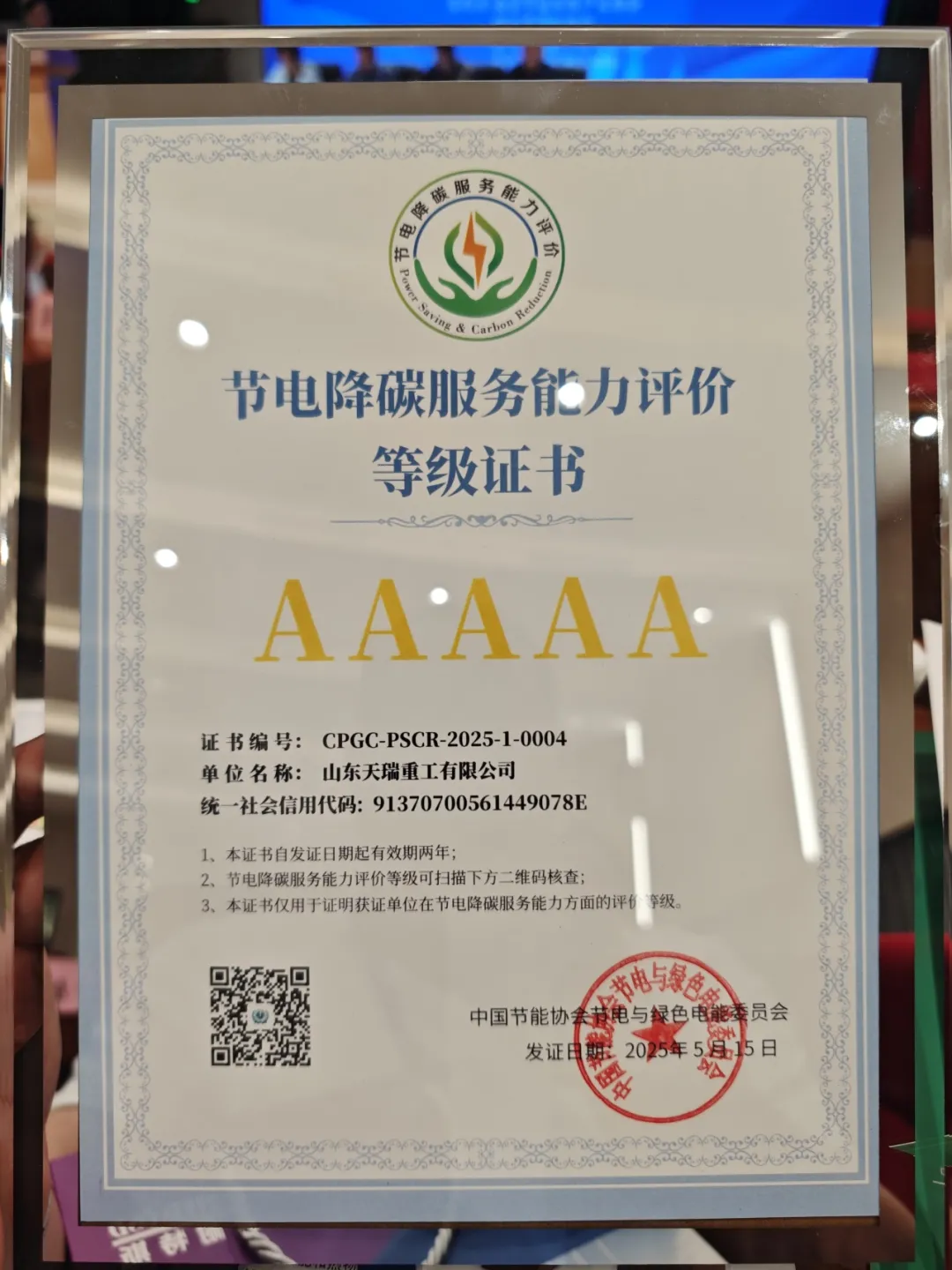 活動(dòng)期間,天瑞重工榮膺“2025年第 一批節(jié)電降碳服務(wù)能力評(píng)價(jià)AAAAA級(jí)單位”稱號(hào)!該認(rèn)證由權(quán)威機(jī)構(gòu)及專家評(píng)定,從技術(shù)研發(fā)、項(xiàng)目落地、碳減排成效等多維度綜合考核,再次肯定了天瑞重工在綠色服務(wù)領(lǐng)域的突 出貢獻(xiàn)和領(lǐng) 先地位。